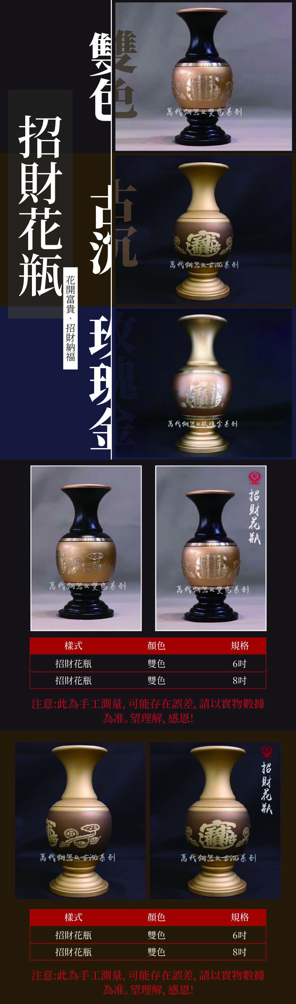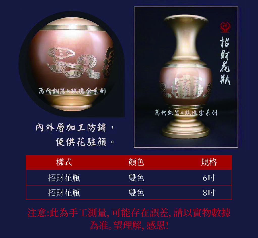 home 首頁 navigate_next 產品專區 navigate_next (C)萬代銅器 navigate_next (C-6)花瓶/雕花果盤/鍛銅燭台 navigate_next 招財花瓶