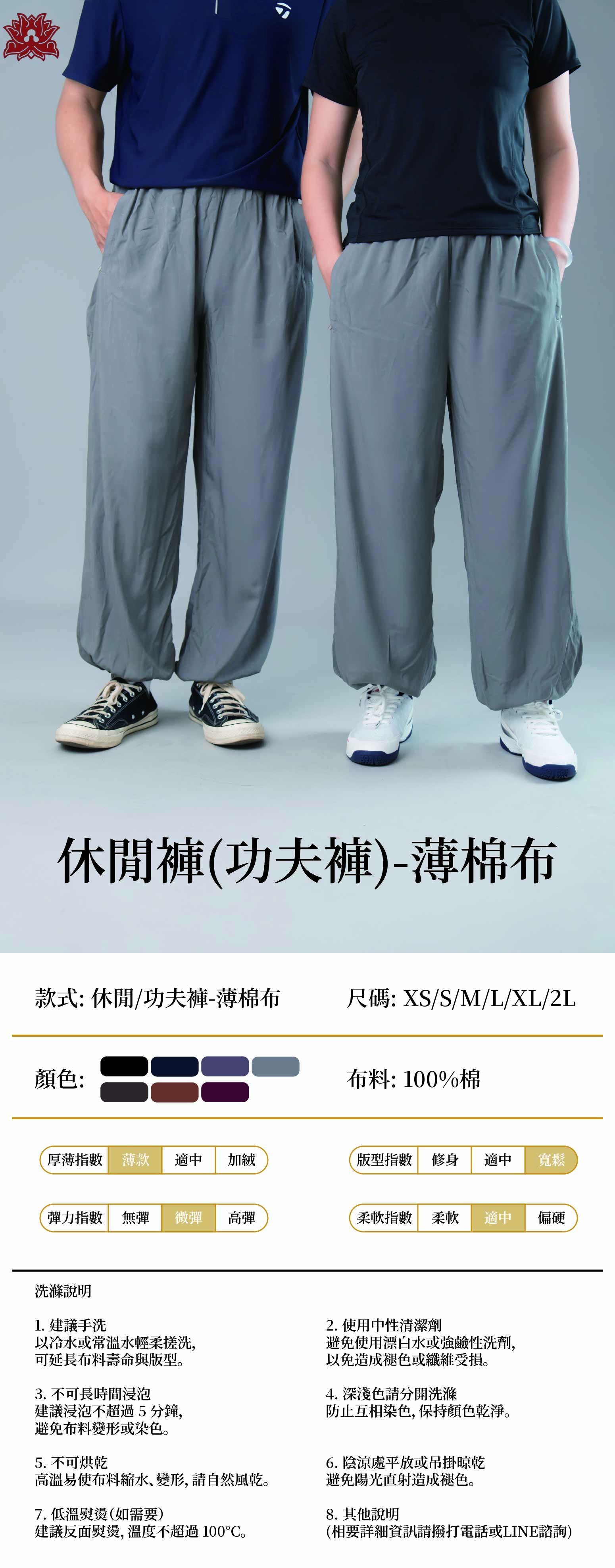 home 首頁 navigate_next 產品專區 navigate_next (H)日常衣服 navigate_next (H-2)功夫褲 navigate_next 休閒褲(功夫褲)-薄棉布