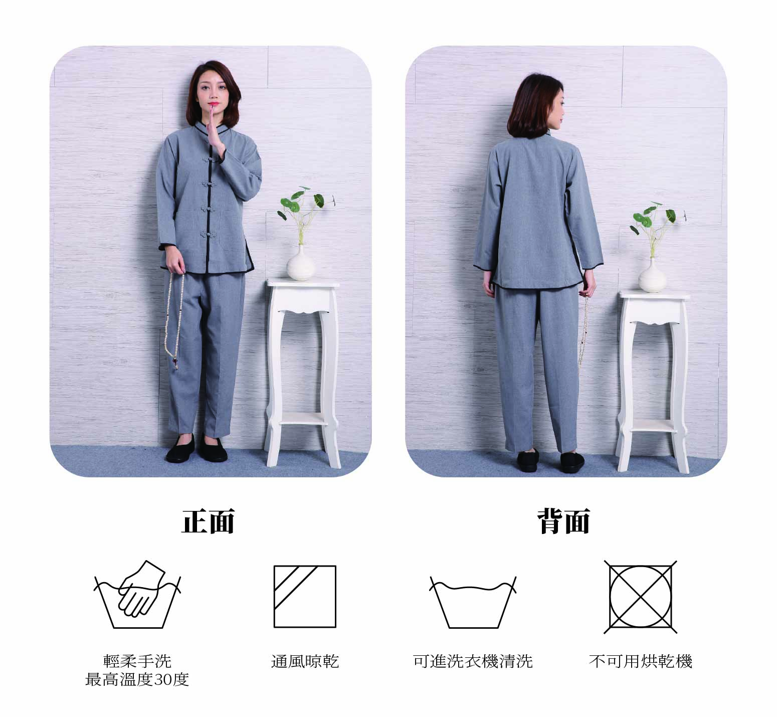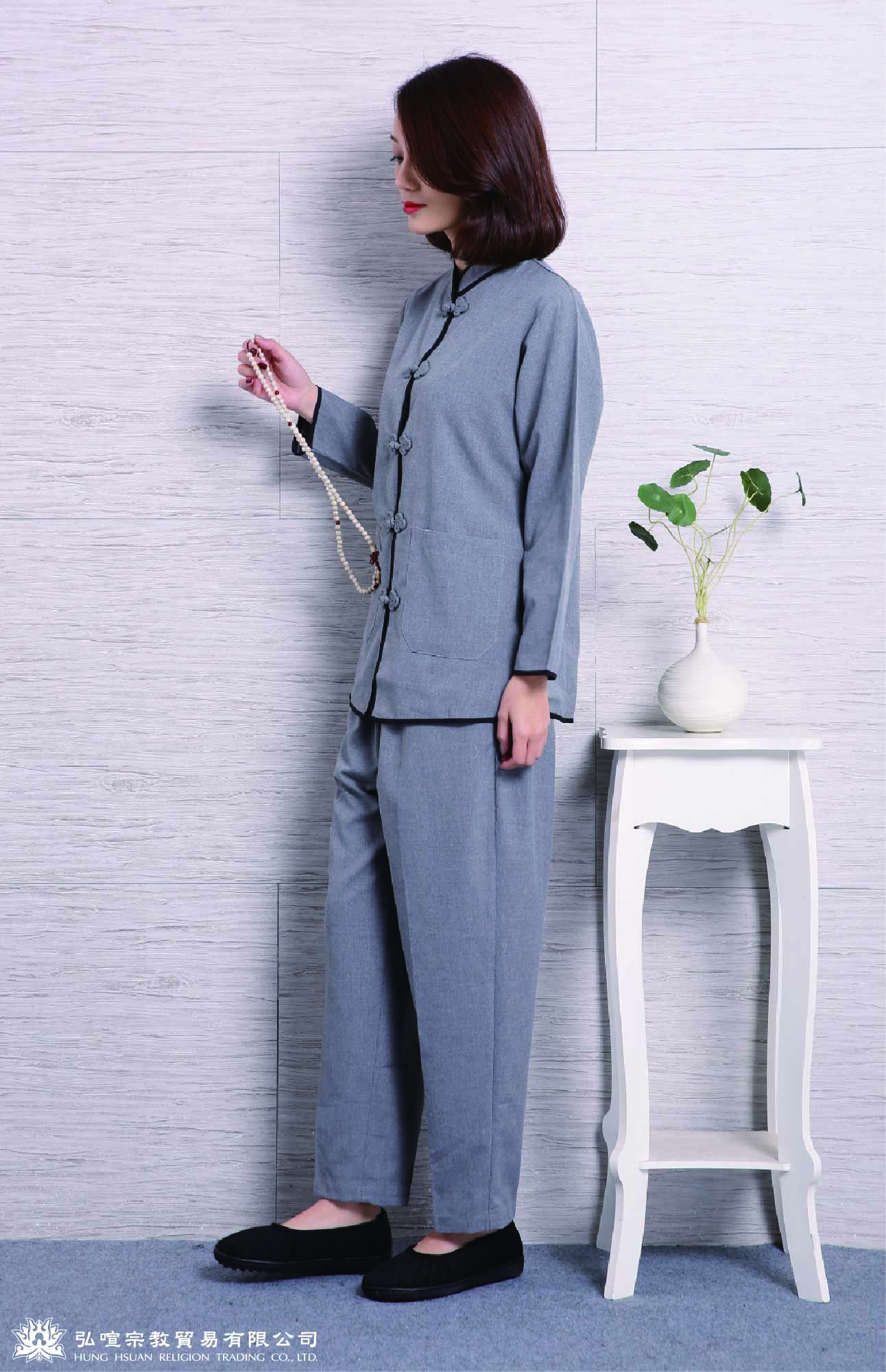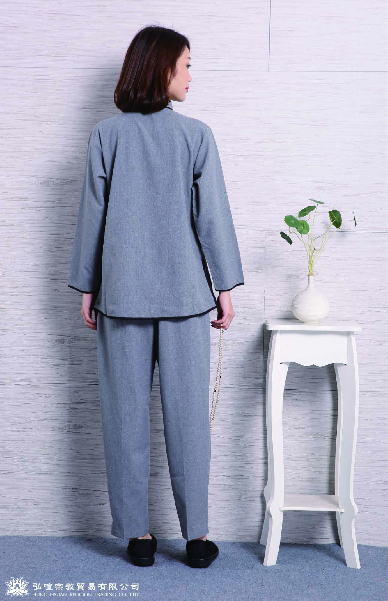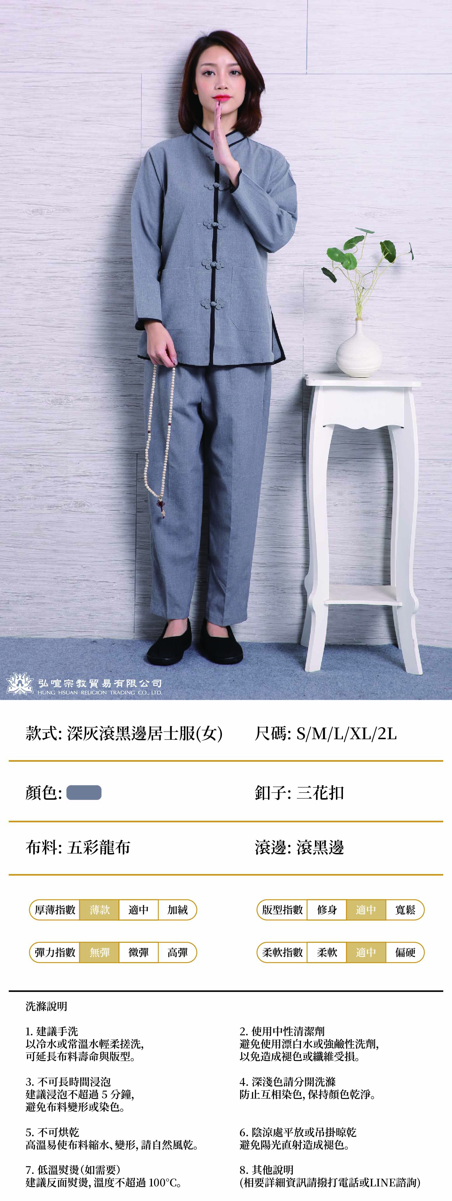 home 首頁 navigate_next 產品專區 navigate_next (F)佛教衣服 navigate_next (F-1)居士服 navigate_next 深灰滾黑邊居士服(三花扣)(女)