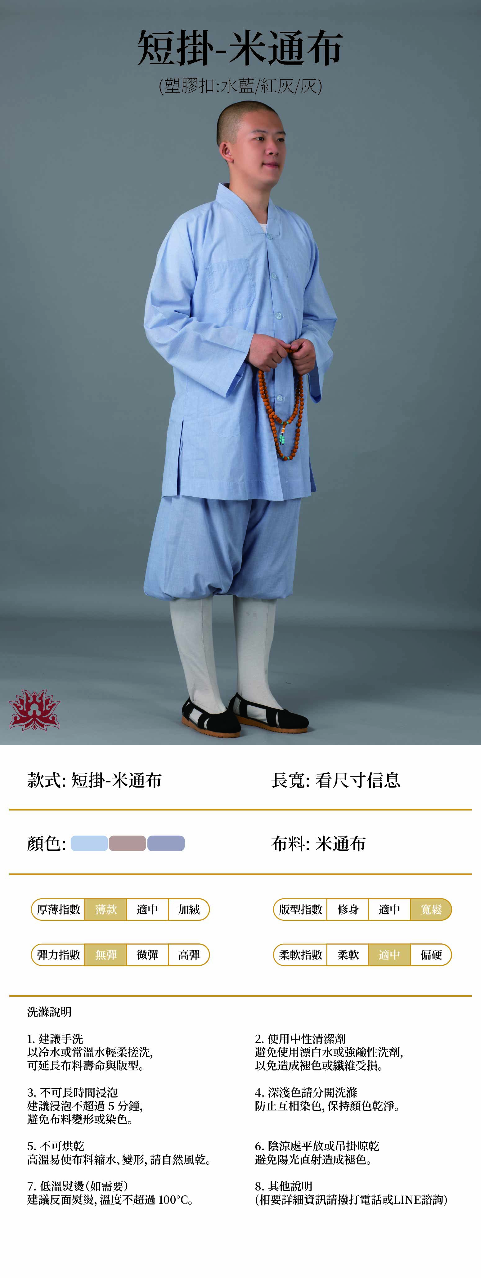 home 首頁 navigate_next 產品專區 navigate_next (E)弘喧僧服 navigate_next (E-3)短掛 navigate_next 短掛-米通布(塑膠扣)
