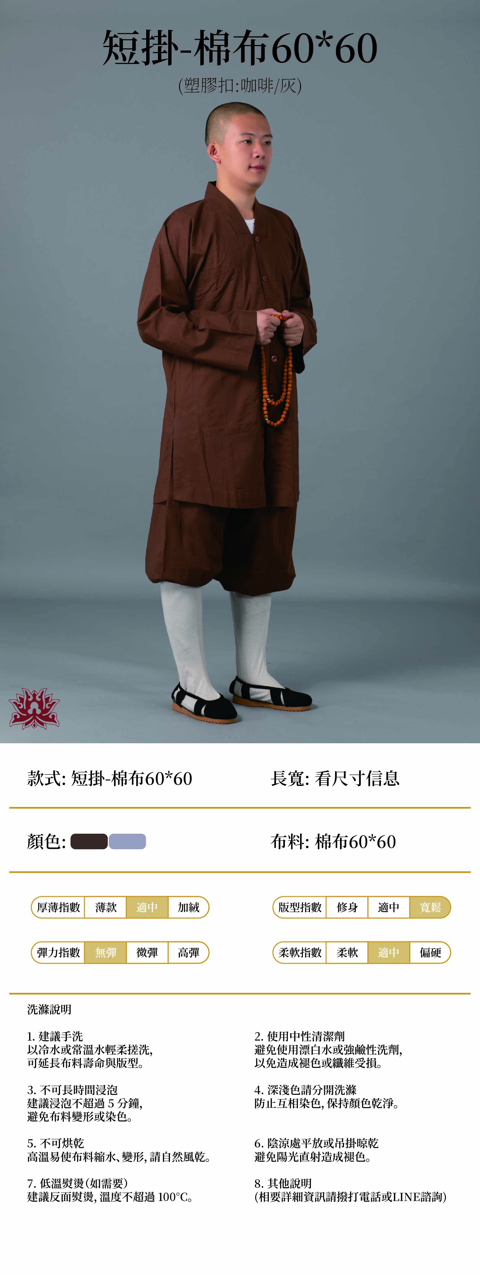 home 首頁 navigate_next 產品專區 navigate_next (E)弘喧僧服 navigate_next (E-3)短掛 navigate_next 短掛-棉布60*60(塑膠扣)