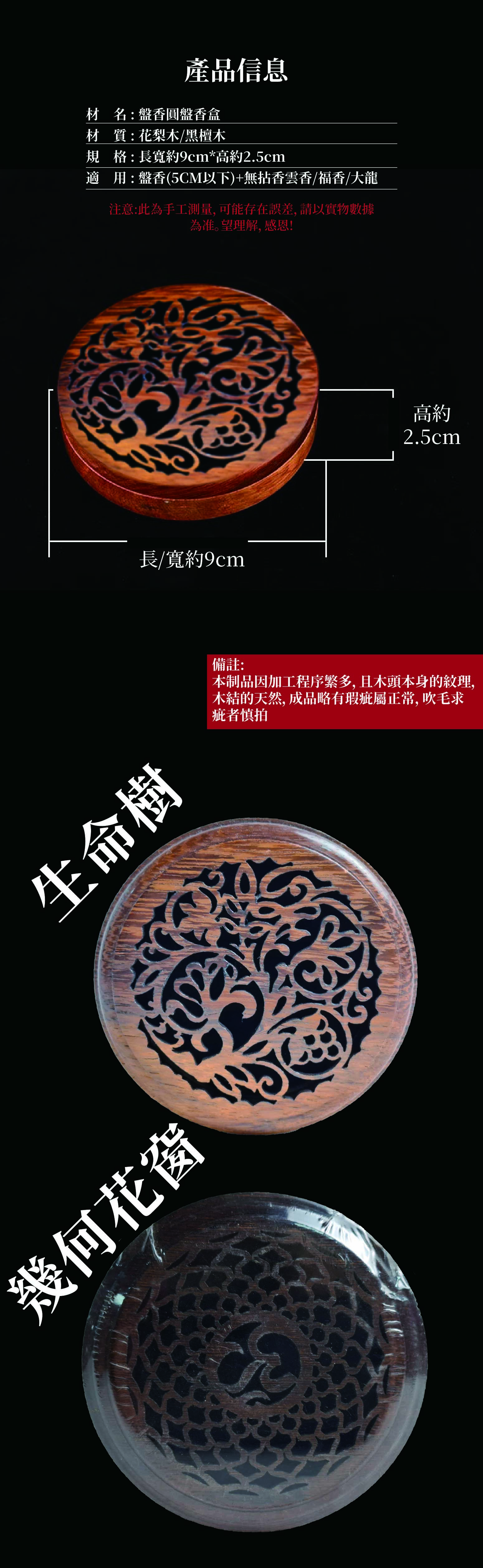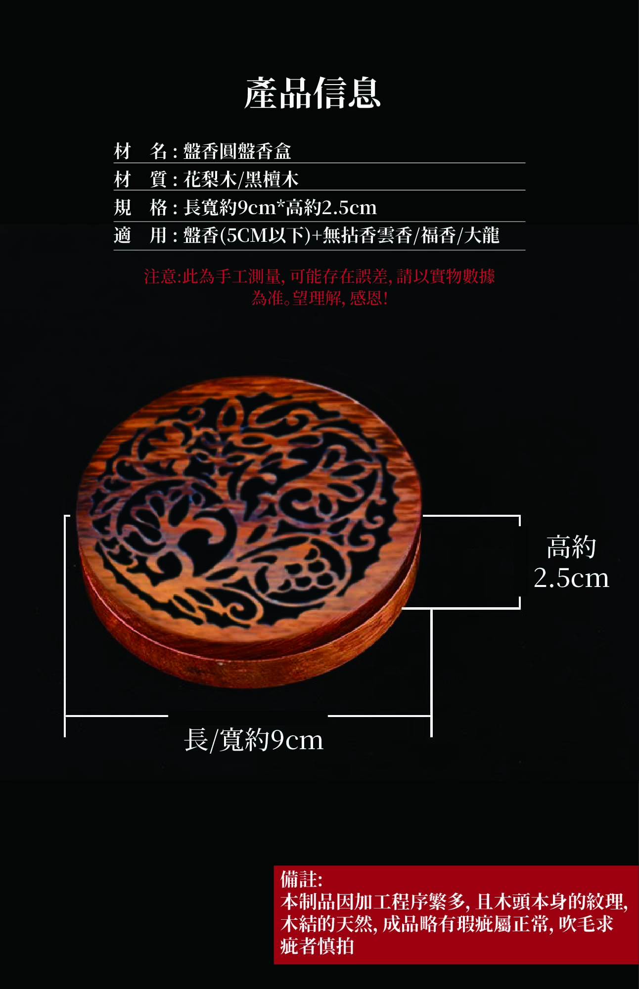 home 首頁 navigate_next 產品專區 navigate_next (D)弘喧沉香香品 navigate_next (D-9)香架/香爐/香插座 navigate_next 盤香圓盤香盒