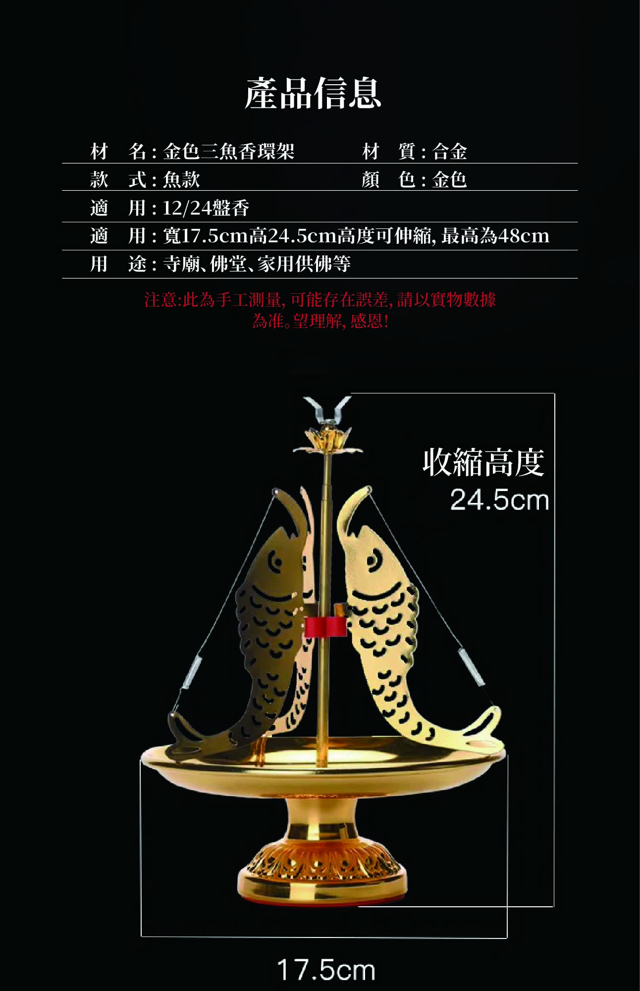 home 首頁 navigate_next 產品專區 navigate_next (D)弘喧沉香香品 navigate_next (D-9)香架/香爐/香插座 navigate_next 金色三魚香環架