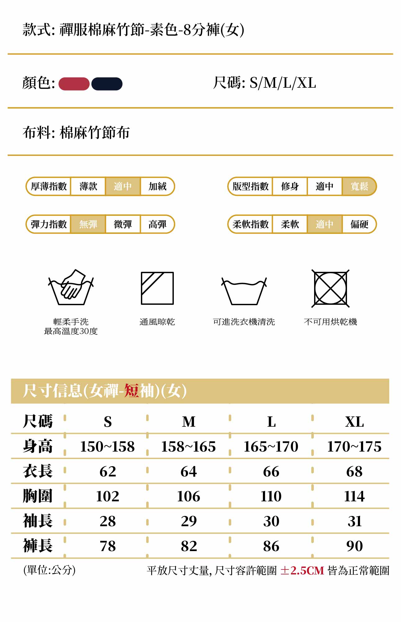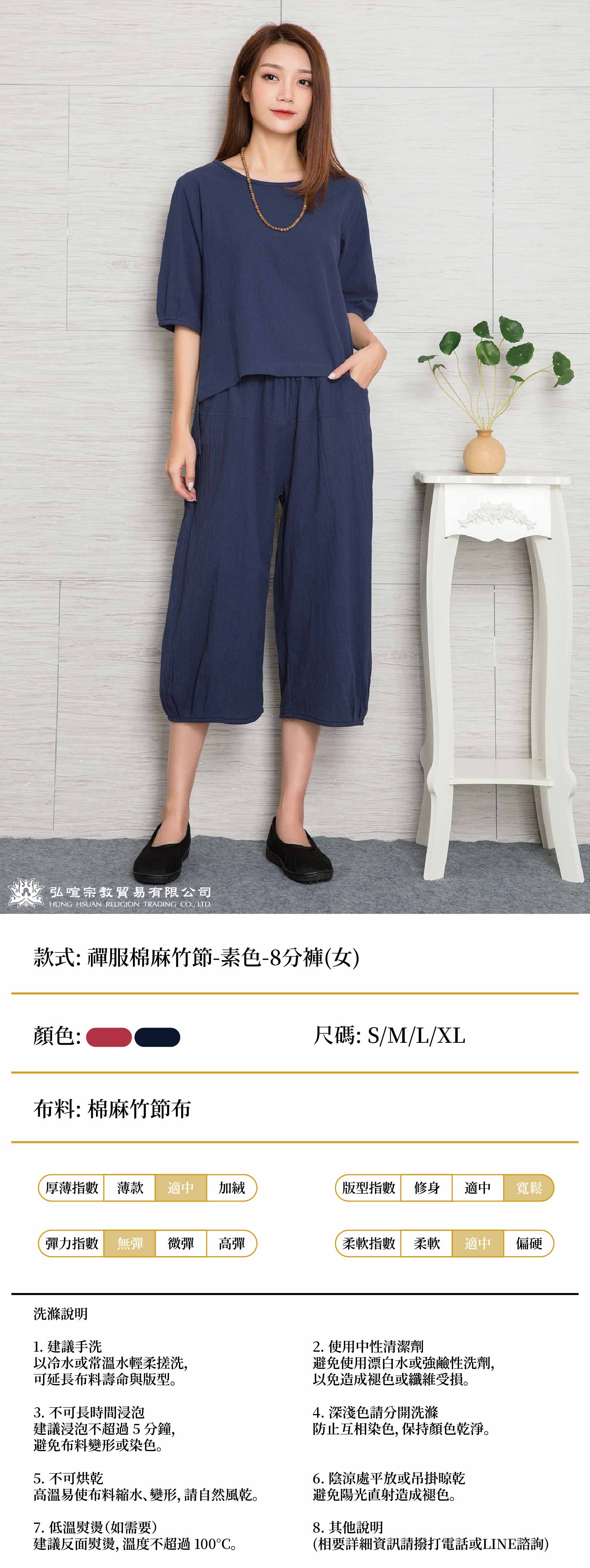 home 首頁 navigate_next 產品專區 navigate_next (H)日常衣服 navigate_next (H-1)禪服 navigate_next 女禪服棉麻竹節-素色-8分褲
