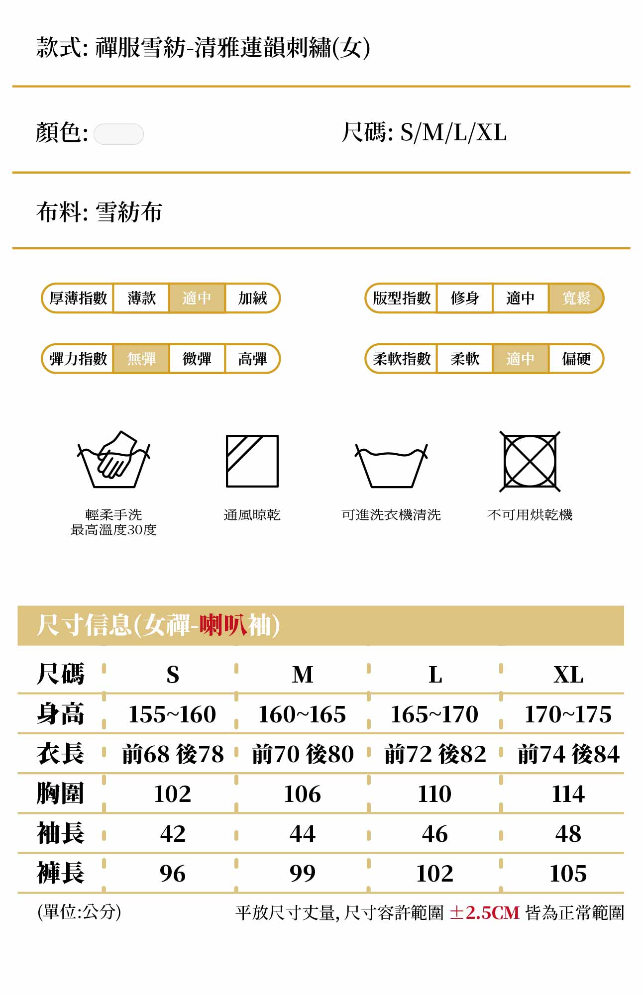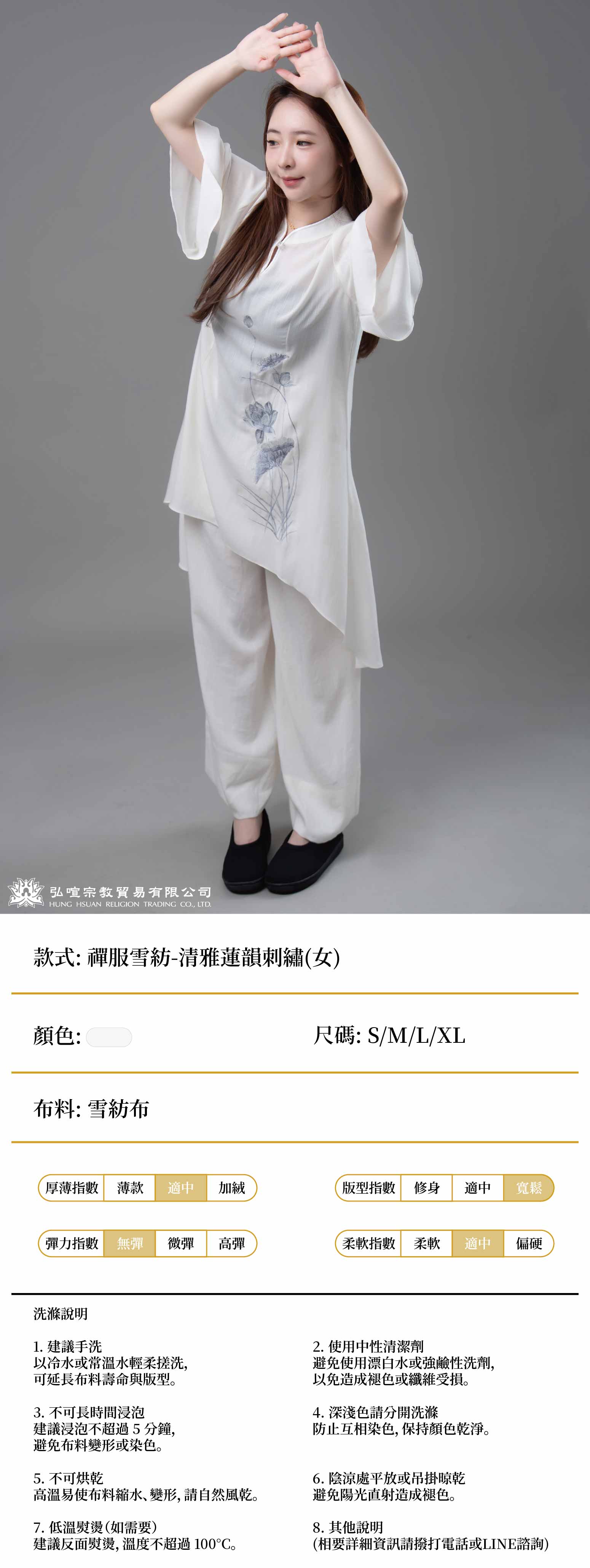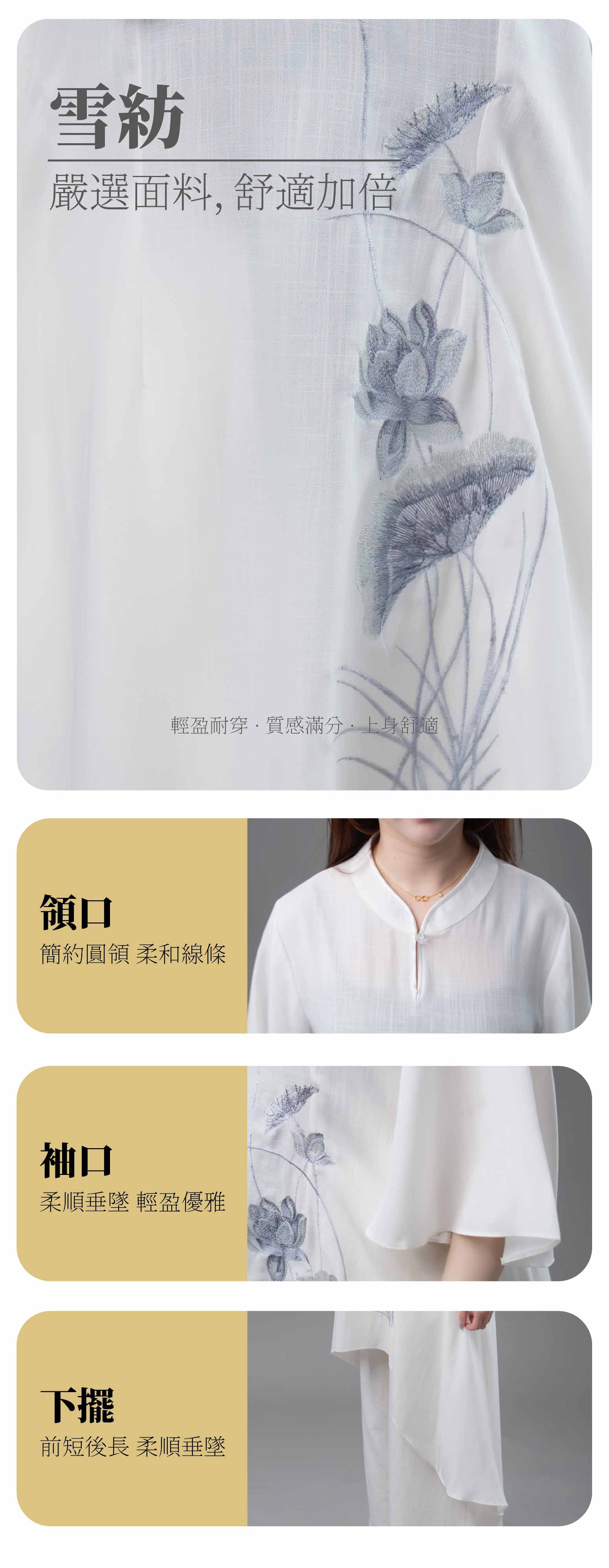 home 首頁 navigate_next 產品專區 navigate_next (H)日常衣服 navigate_next (H-1)禪服 navigate_next 女禪雪紡-清雅蓮韻刺繡